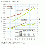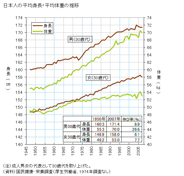 上の図を見ると解るが、なぜだかは解らないが弥生時代からは日本人の平均身長はどんどん小さくなり江戸時代末期には155cmくらいだったようである。そして戦後急に身長は伸びてきて男女とも身長は10cm程度大きくなったようである。現在男性で170cm、女性で158cmが平均のようだ。