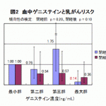 保存血液を用いて血漿中イソフラボン(ゲニステインとダイゼイン)濃度を測定し、それぞれ値によって最も低いから最も高いまでの4つのグループに分け、乳がんリスクを比較しました。